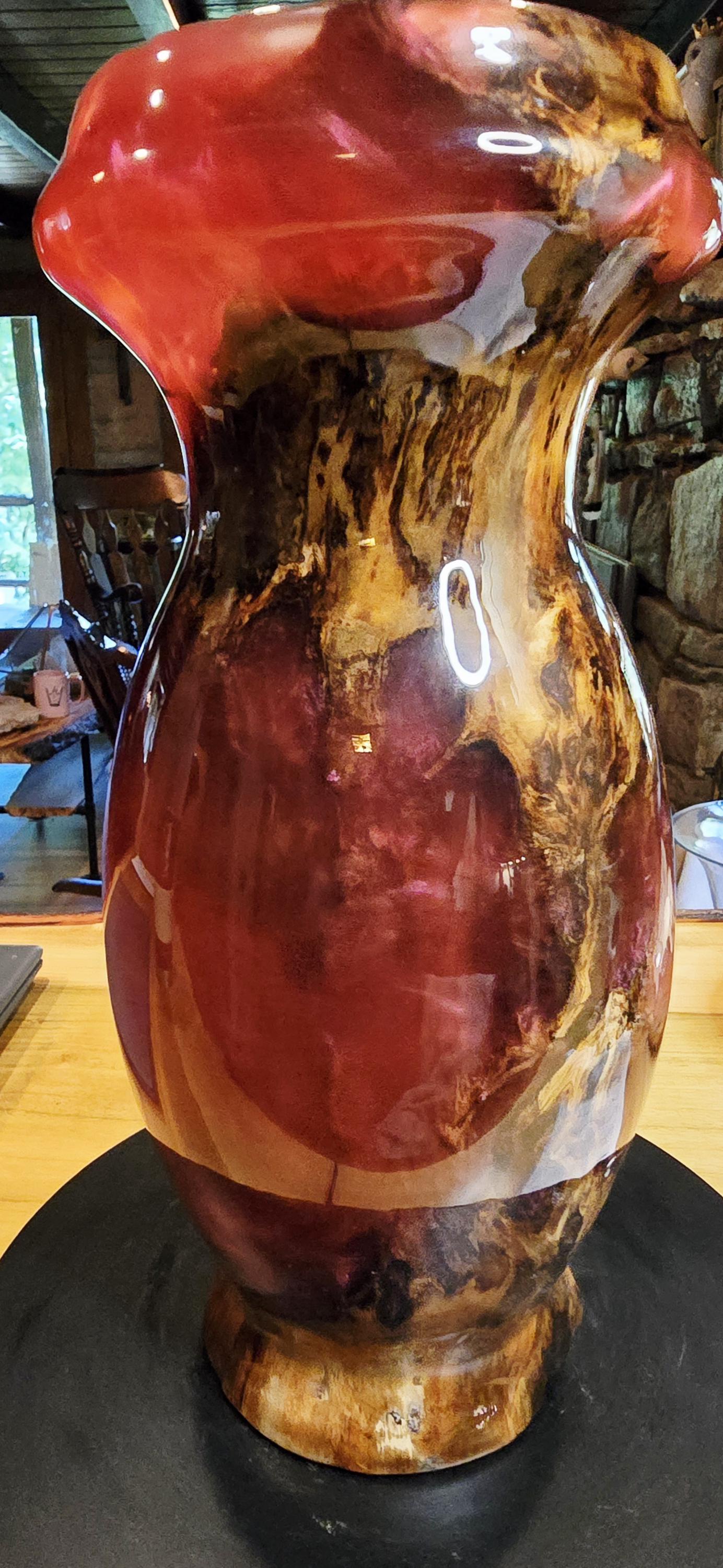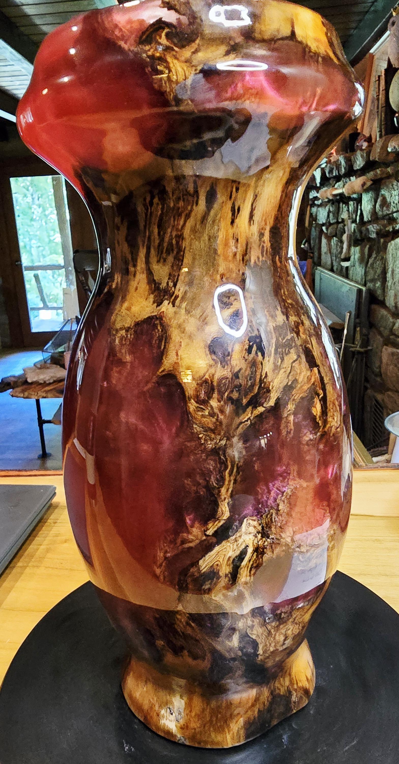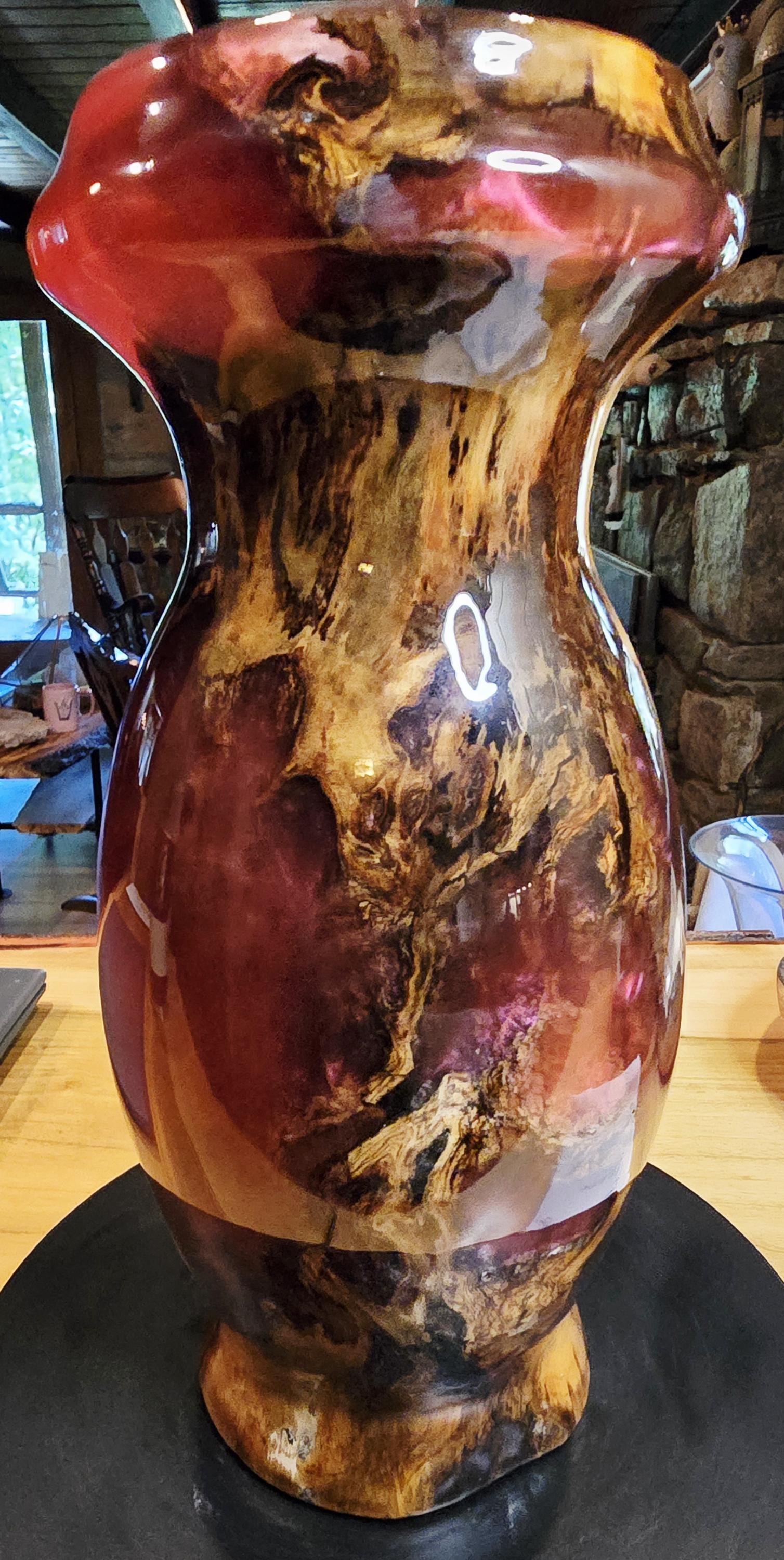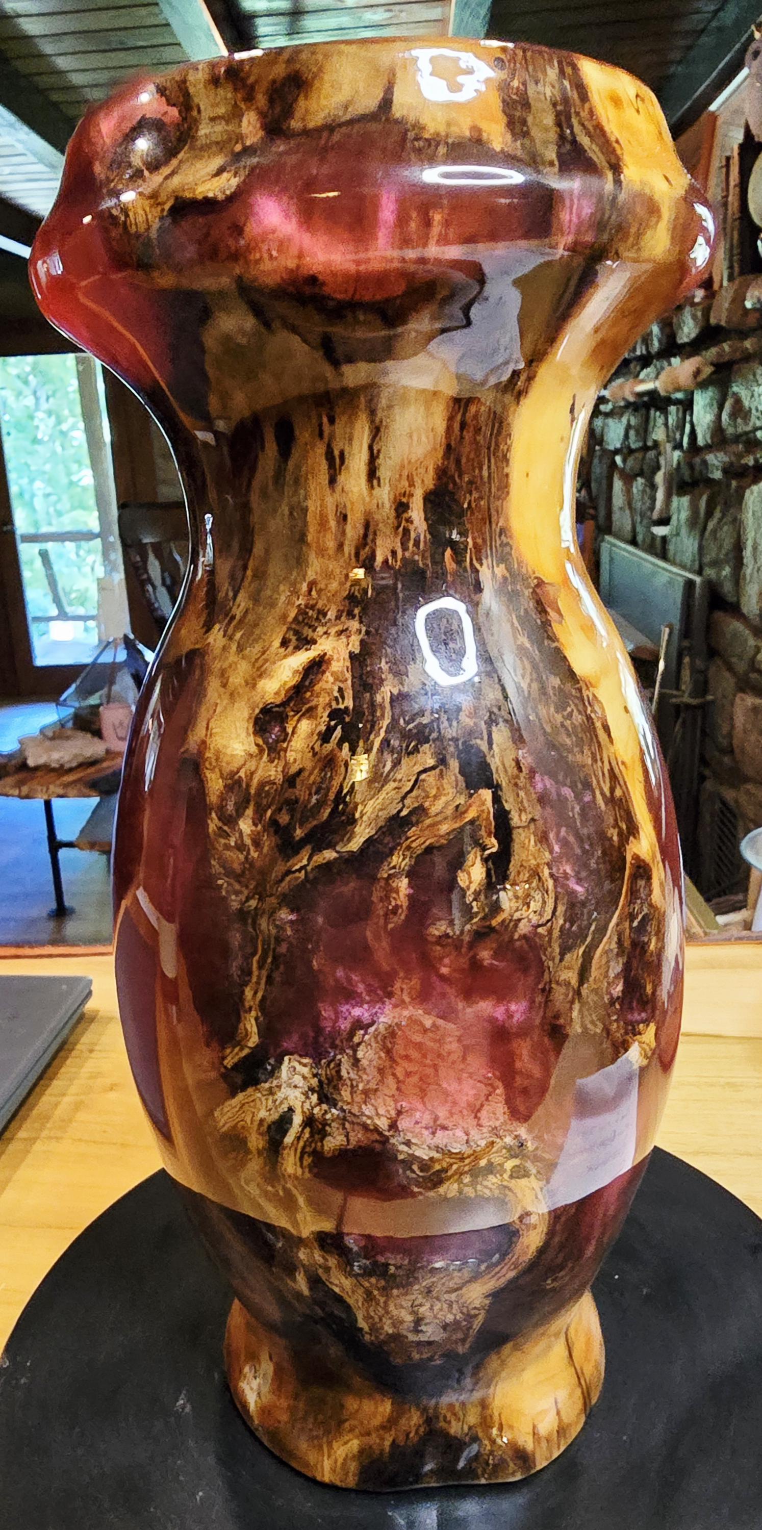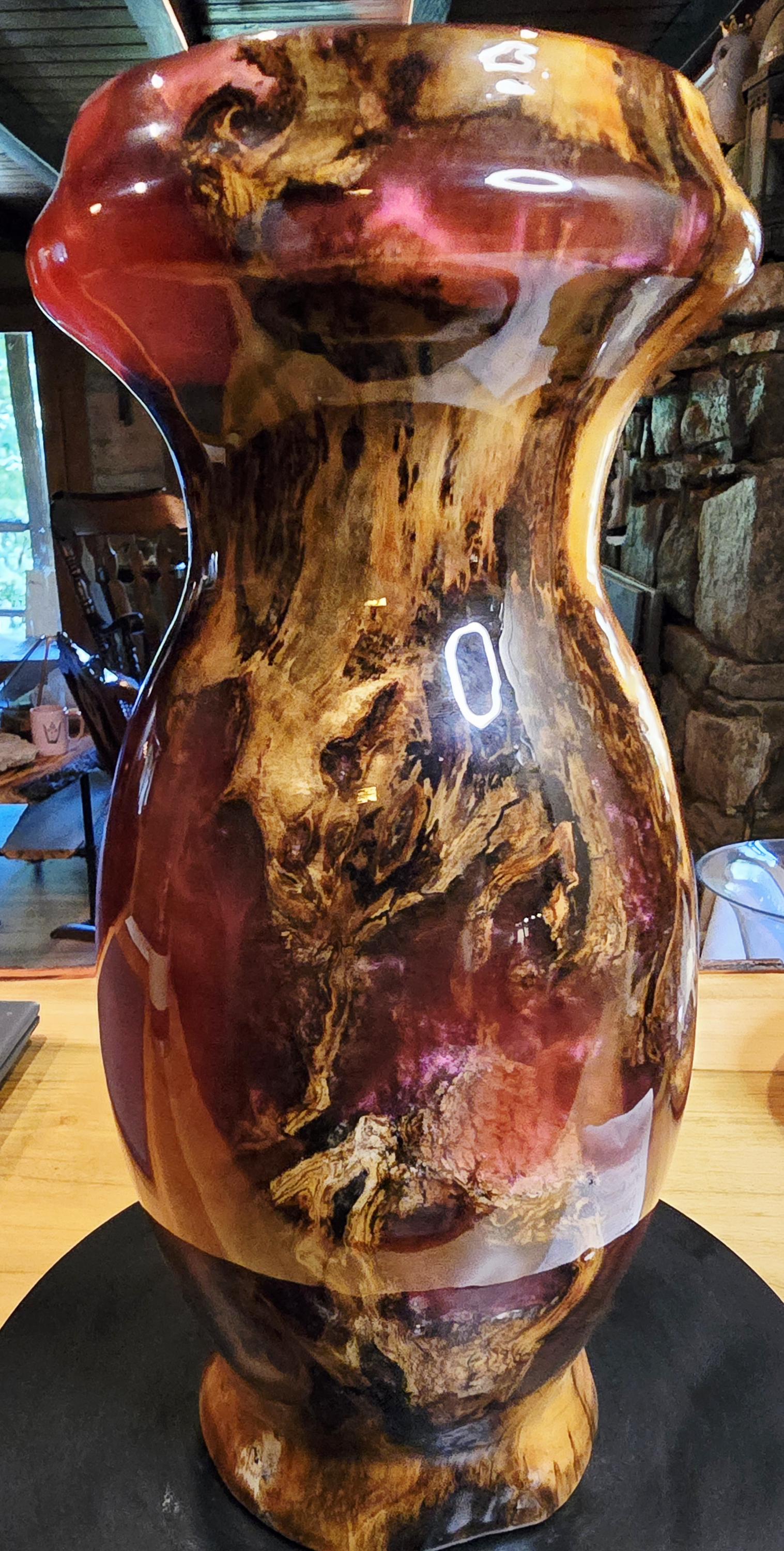 This vase is a box elder burl and burgundy epoxy with a hint of pink mica in it. It is 12in tall and 5in wide at the center. I has a unique mix of burl wood sections and epoxy sections on the outside but the inside is mostly Box Elder burl. it's one of three pieces that came from this boxelder burl.