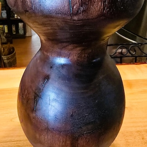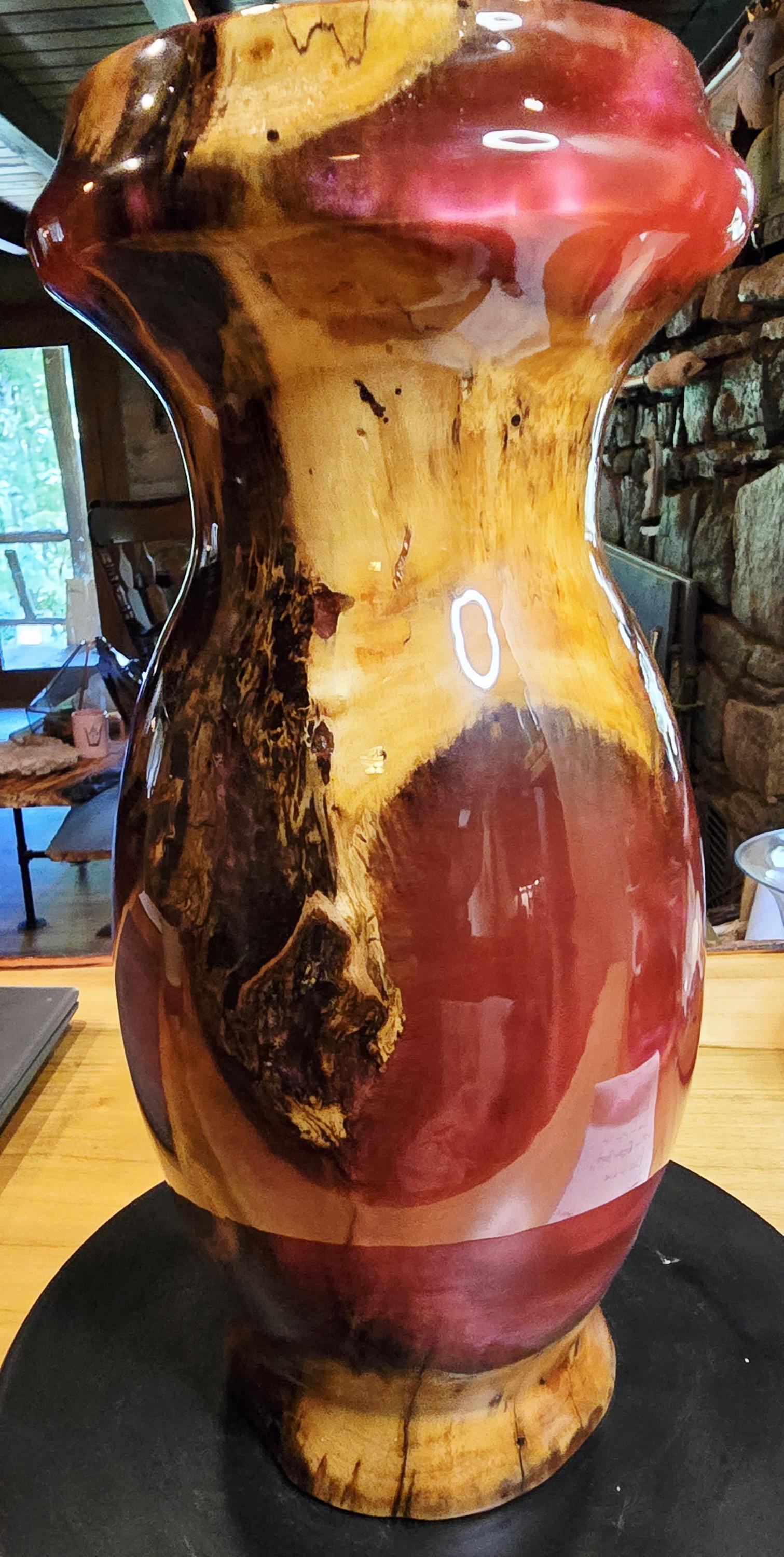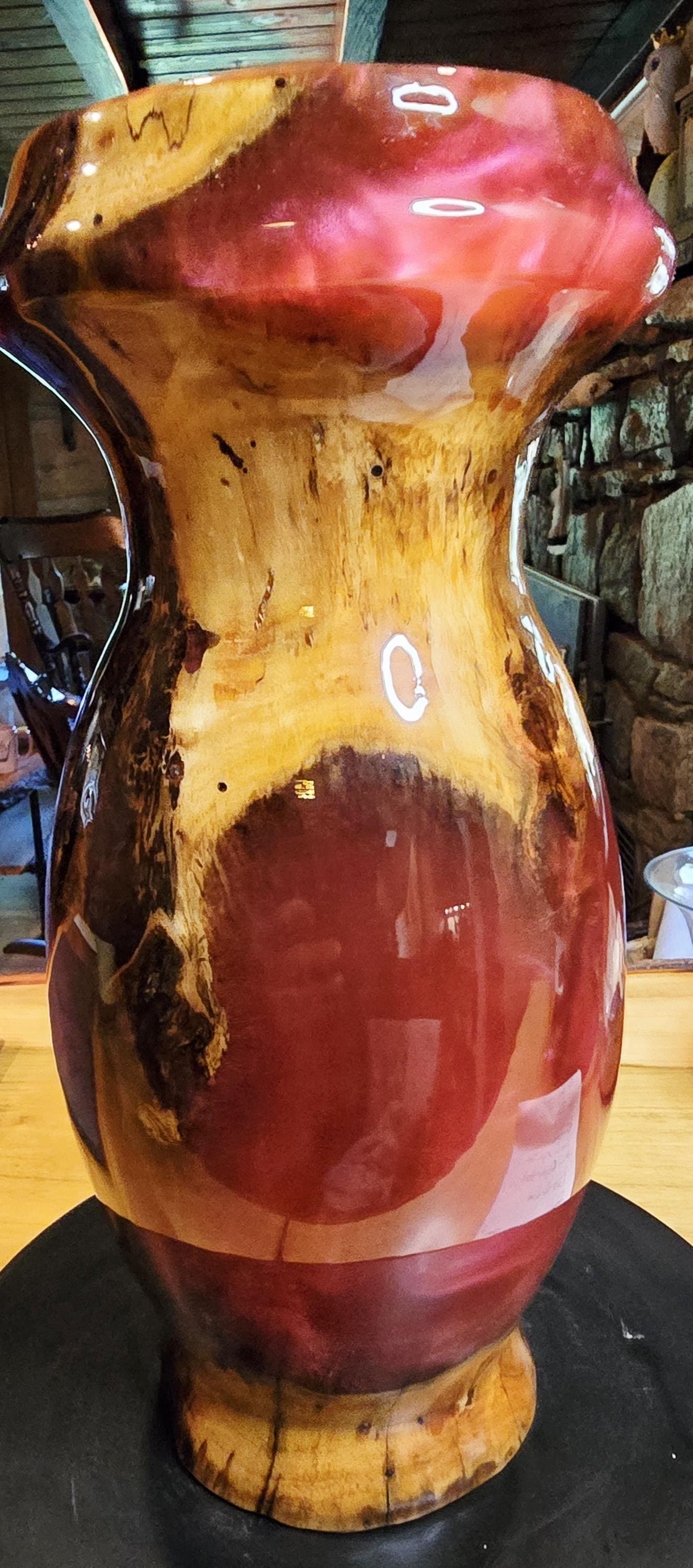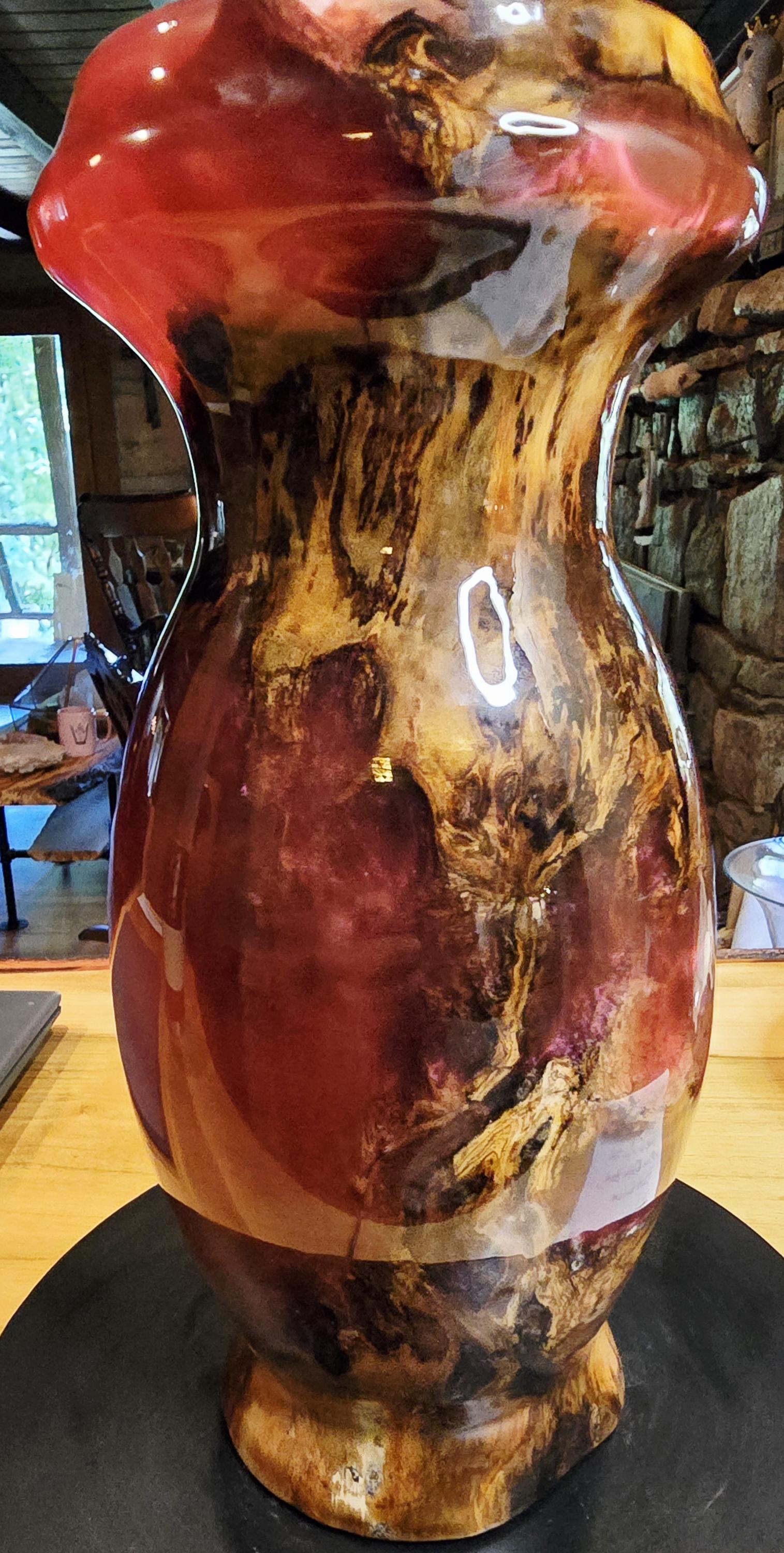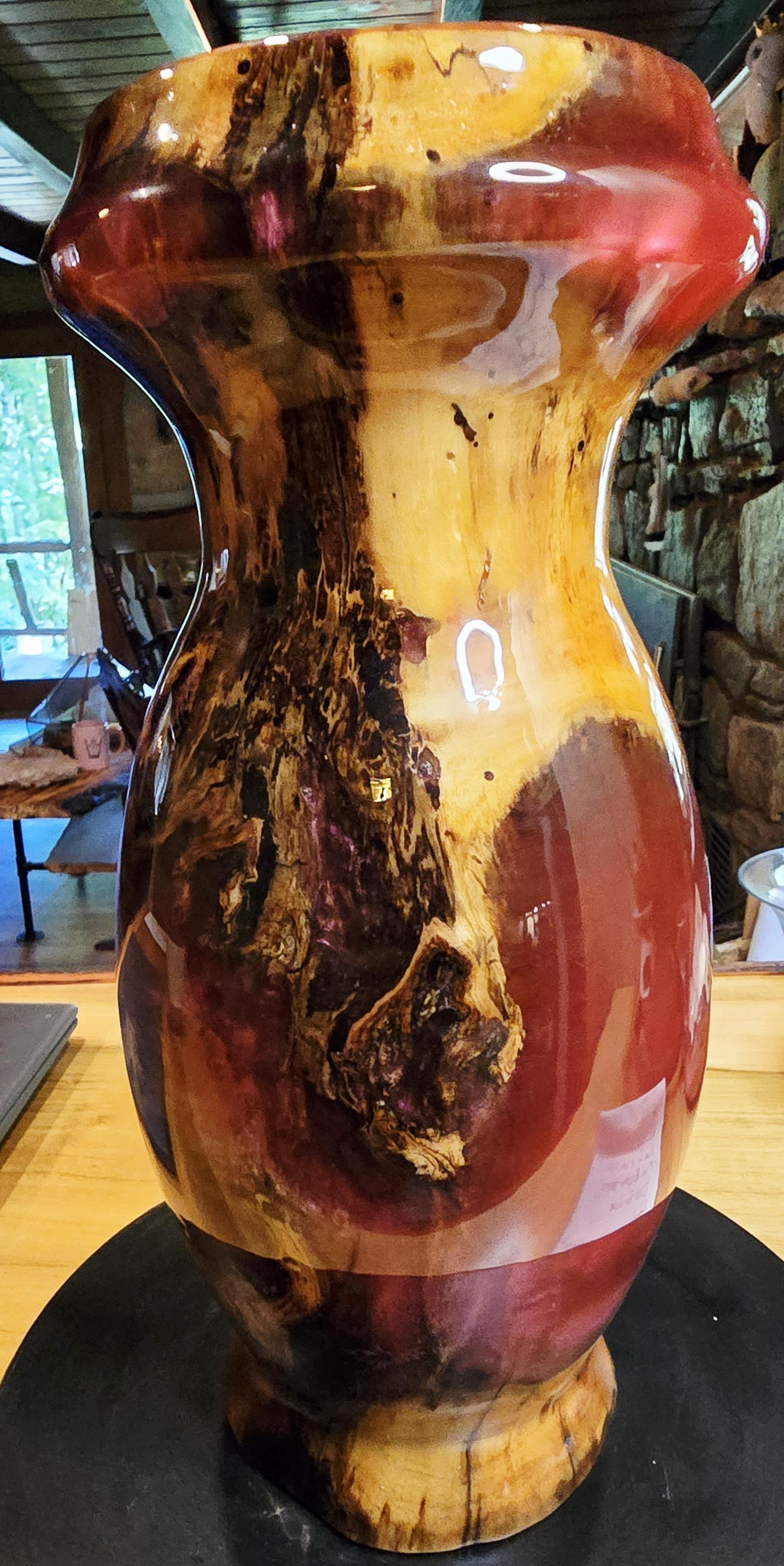 This vase is a box elder burl and burgundy epoxy with a hint of pink mica in it. It is 12in tall and 5in wide at the center. I has a unique mix of burl wood sections and epoxy sections on the outside but the inside is mostly Box Elder burl. it's one of three pieces that came from this boxelder burl.